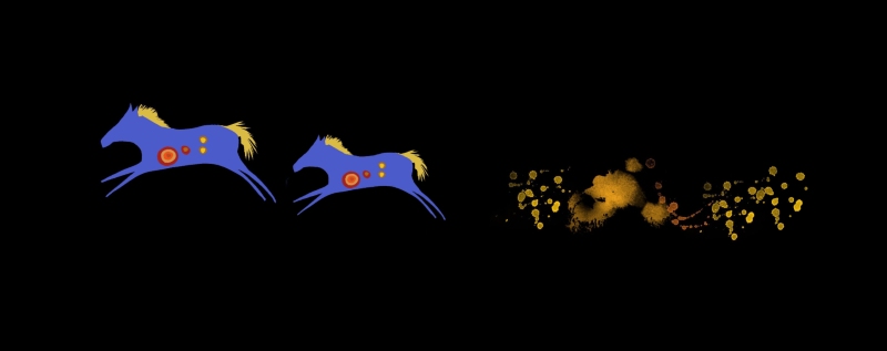 I wanted something that was bold & simple - something that with a splash of color says ‘We Are Still Here’, we have a beautiful language, we have a visual vocabulary…. I knew I wanted bold, strong colors and a sense of movement. I also wanted to touch on the spiritual connection that rider & horse share. After many false starts I settled on the simplest representation of a horse - where petroglyphs & pictographs meet Matisse. By simplifying the horse to just its primary shape I was able to give the color chosen and each marking more importance.
