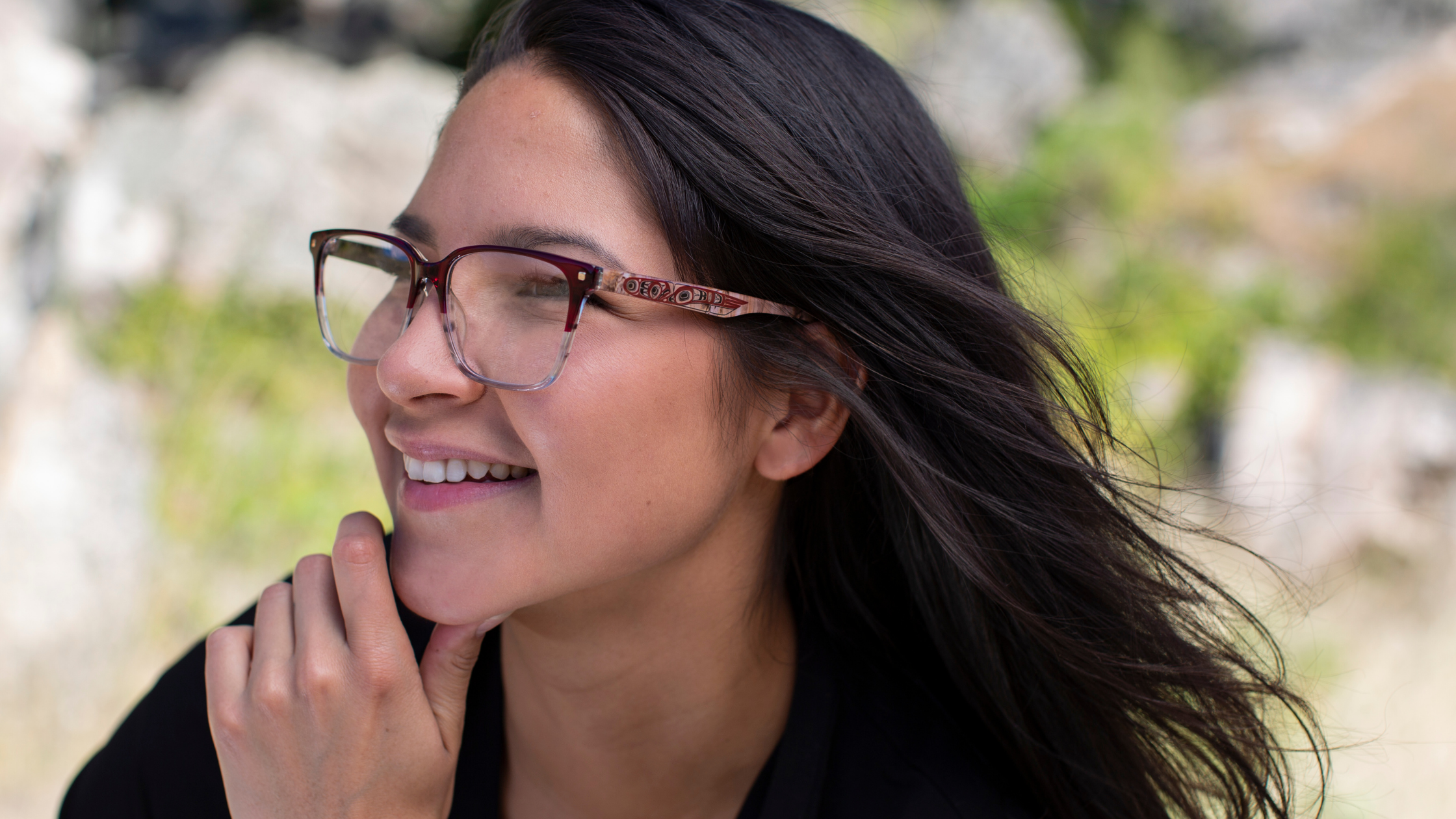 After you determine your measurements, the fun part begins! Head on over to explore our selection of optical frames. We offer a variety of unique styles that feature incredible designs by First Nations artists. There is a frame available for every face shape. If you would like to find which frame style will fit your ideal measurements best, click here for a list of the exact sizing details for each frame.