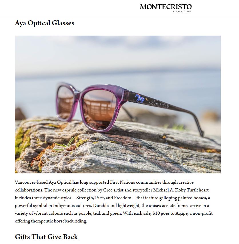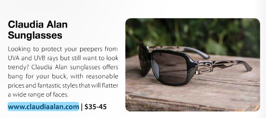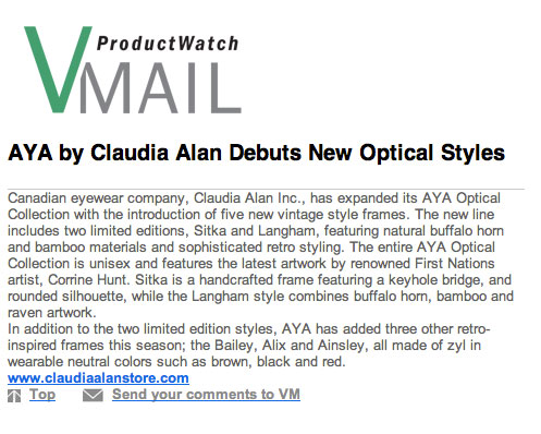 June 21, 2010We've got the glasses, now show us some sun "We recently checked out some sunglasses from AYA Accessories that feature authentic First Nations artwork from Corinne Hunt, co-designer of the Olympic and Paralympic medals for the 2010 Vancouver Winter Games." Read the full story over at: VitaminDaily.com February 24, 2010Claudia Alan Product Testimonials We've put together a number of product testimonials from our customers. If you'd like to read the testimonials, please Click here to download a PDF. August 10, 2009Aya Eyewear on Urban Rush