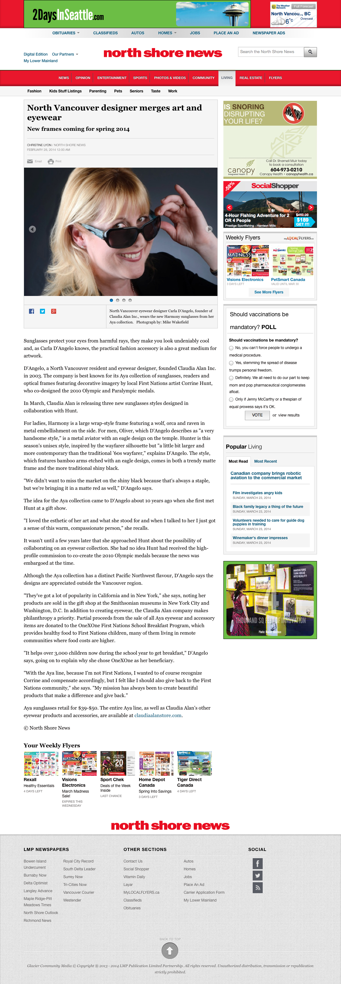 Georgia StraightMarch 2016 Canadian Living MagazineFebruary 2016 Fashion MagazineAugust 2014 Chatelaine MagazineJuly 2014 Westcoast FamiliesMay 2014 Vancouver MagazineMarch 2014 Optik MagazineMarch 2014 North Shore NewsFebruary 2014 FashionLedge.comNovember 2013 Vancouver SunNovember 23, 2013 Vancouvermom.caNovember 22, 2013 Envision MagazineNovember/December 2013 elizabethstreet.comNovember 2013 The Vancouver SunMay 4, 2013 Up MagazineMay 2013 Optik MagazineMay 2013 Cowboys & Indians MagazineApril 2013 Cowboys & Indians MagazineApril 2013 Vision MagazineJan/Feb 2013 Envision MagazineJan/Feb 2013 Her MagazineWinter 2012 Look MagazineWinter 2012 VMailDecember 4, 2012 Opti-NewsNovember 2012 Optical PrismMay/June 2012 Where MagazineApril 2012 Vancouver ProvinceMarch 2011 La RevueMarch 2011 Where MagazineApril 2011 The Globe & MailMarch 2011 BC BusinessMarch 2011 Native Peoples MagazineMarch 2011 Vancouver View MagazineMarch 2011 Opti-news MagazineFebruary 2011 Native Business Development MagazineFebruary 2011 KathouOctober 2010 Opti-news MagazineOctober 2010 FashionMagazine.comJuly 2010 Vancouver ProvinceJuly 2010 Northshore OutlookJune 2010 2020 MagazineApril 2010 Where MagazineDecember 2009 Homemakers MagazineNovember 2009 Edge MagazineApril 2010 The Vancouver CourierMay 2010 Globe & MailOctober 16, 2009 Readers DigestOctober 8, 2009 Optical PrismOctober 2009 Globe & MailSeptember 26, 2009 Vancouver SunSeptember 15, 2009 Vancouver SunSeptember 14, 2009