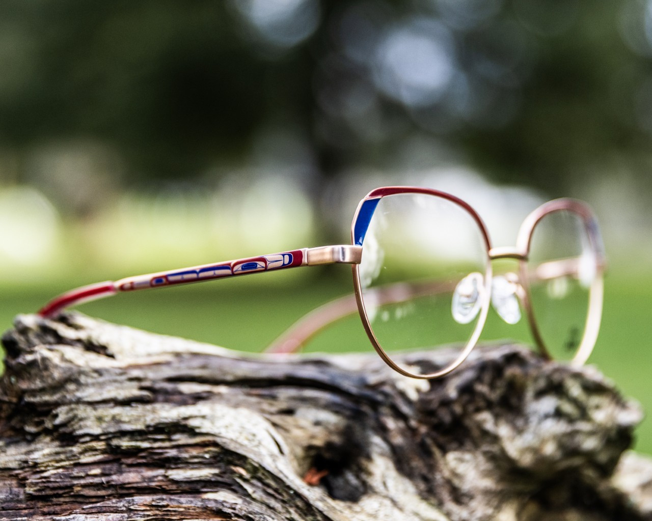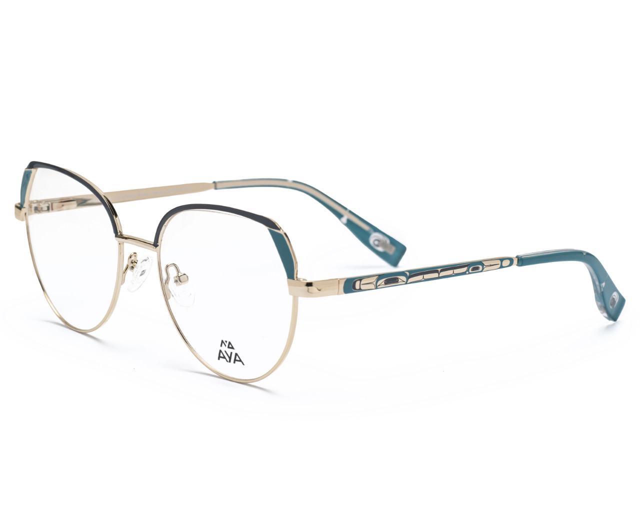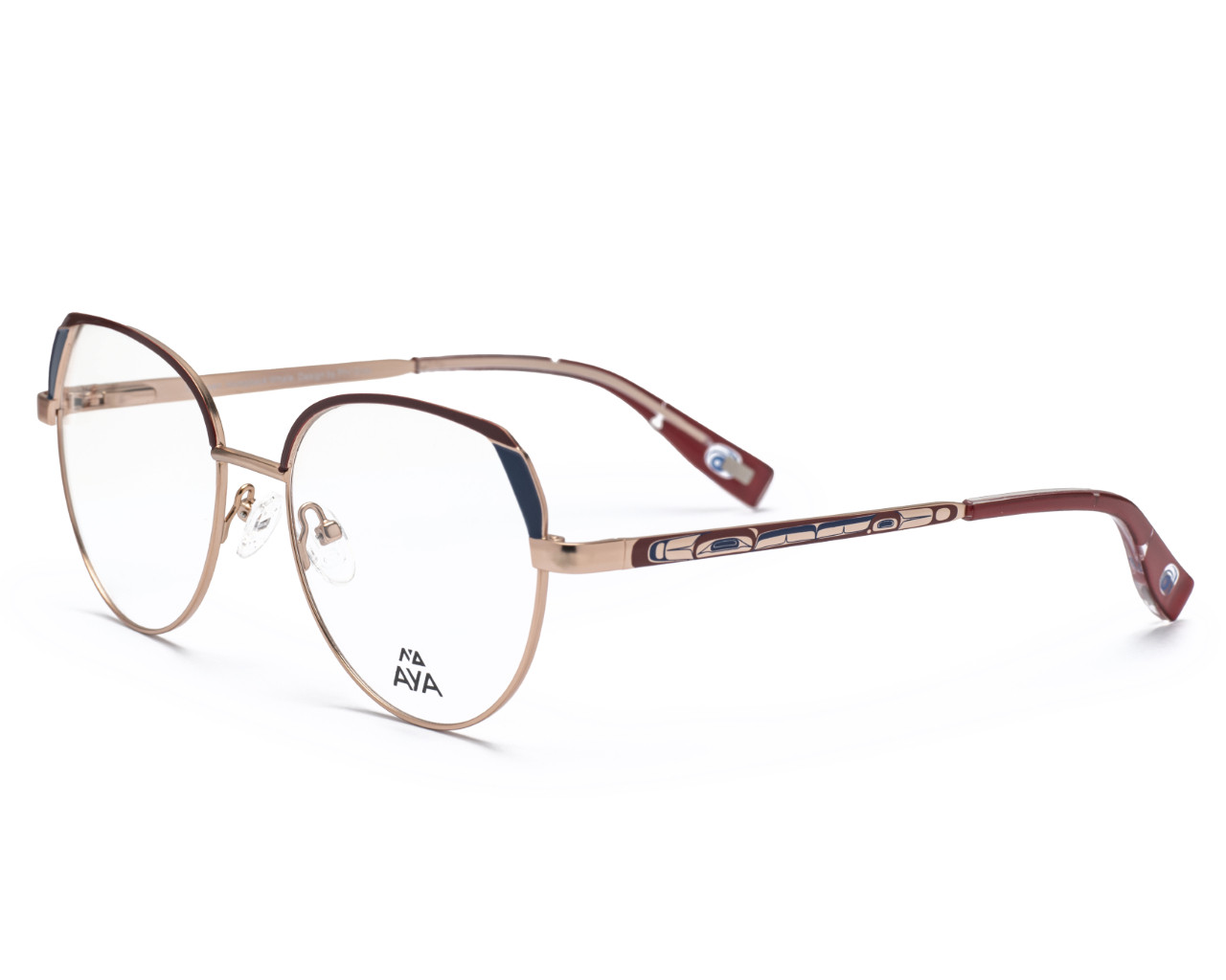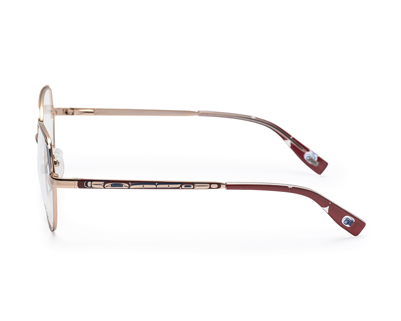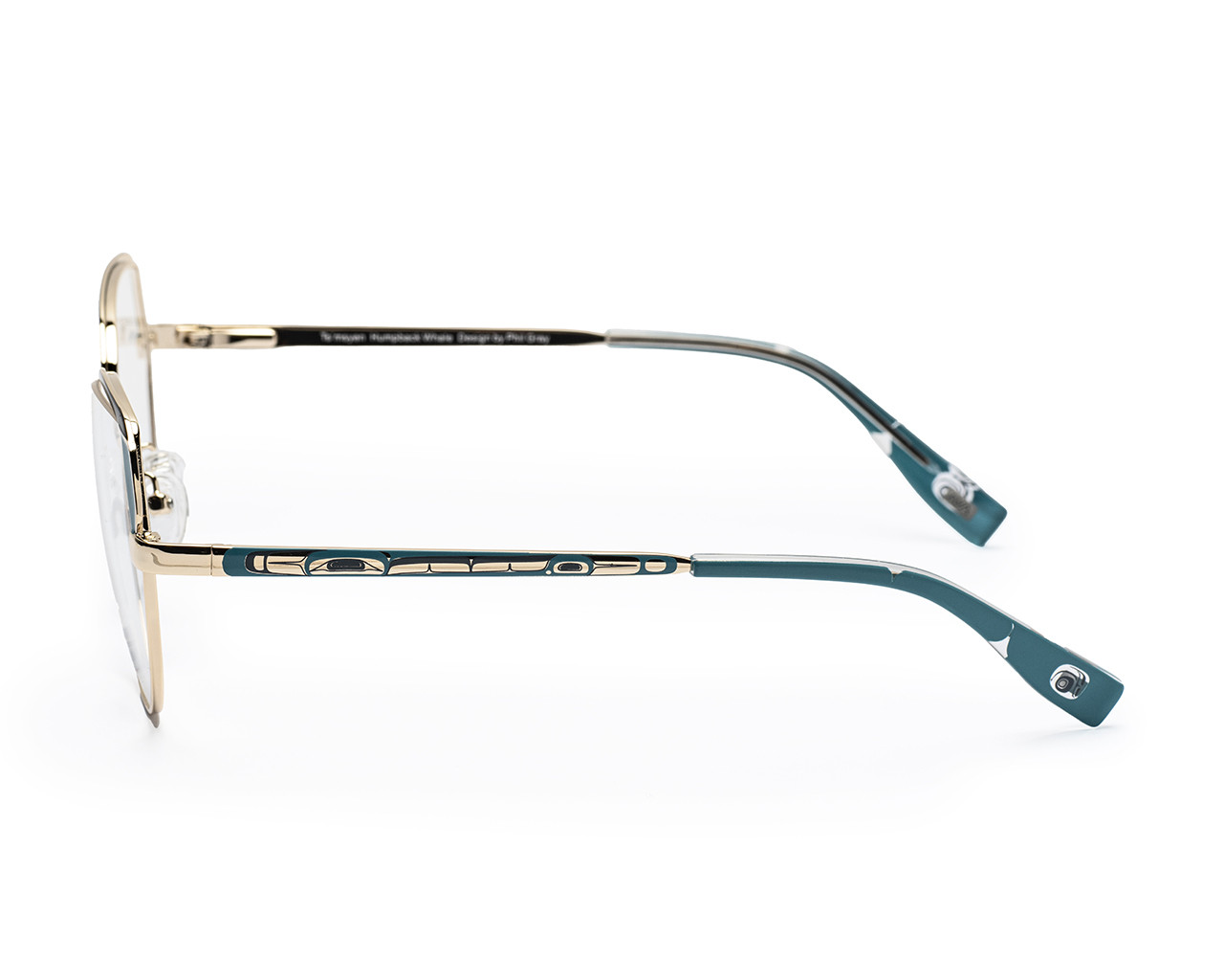 Mikayla, a fresh take on feminine sophistication, is available in striking teal with shiny light gold or rich burgundy with frost rose gold. This oversized lightweight metal frame features intricate enamel detailing and a stunning humpback whale design by artist Phil Gray. Available in two sizes, spring hinges for comfort, adjustable rocking nose pads, and longer temples, Mikayla offers a custom fit with all-day wearability. Its contemporary retro vibe and bold yet elegant design make it a standout accessory, perfect for making a stylish statement.