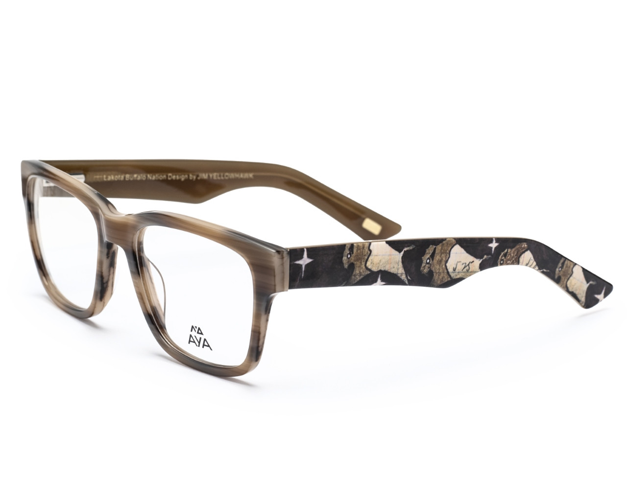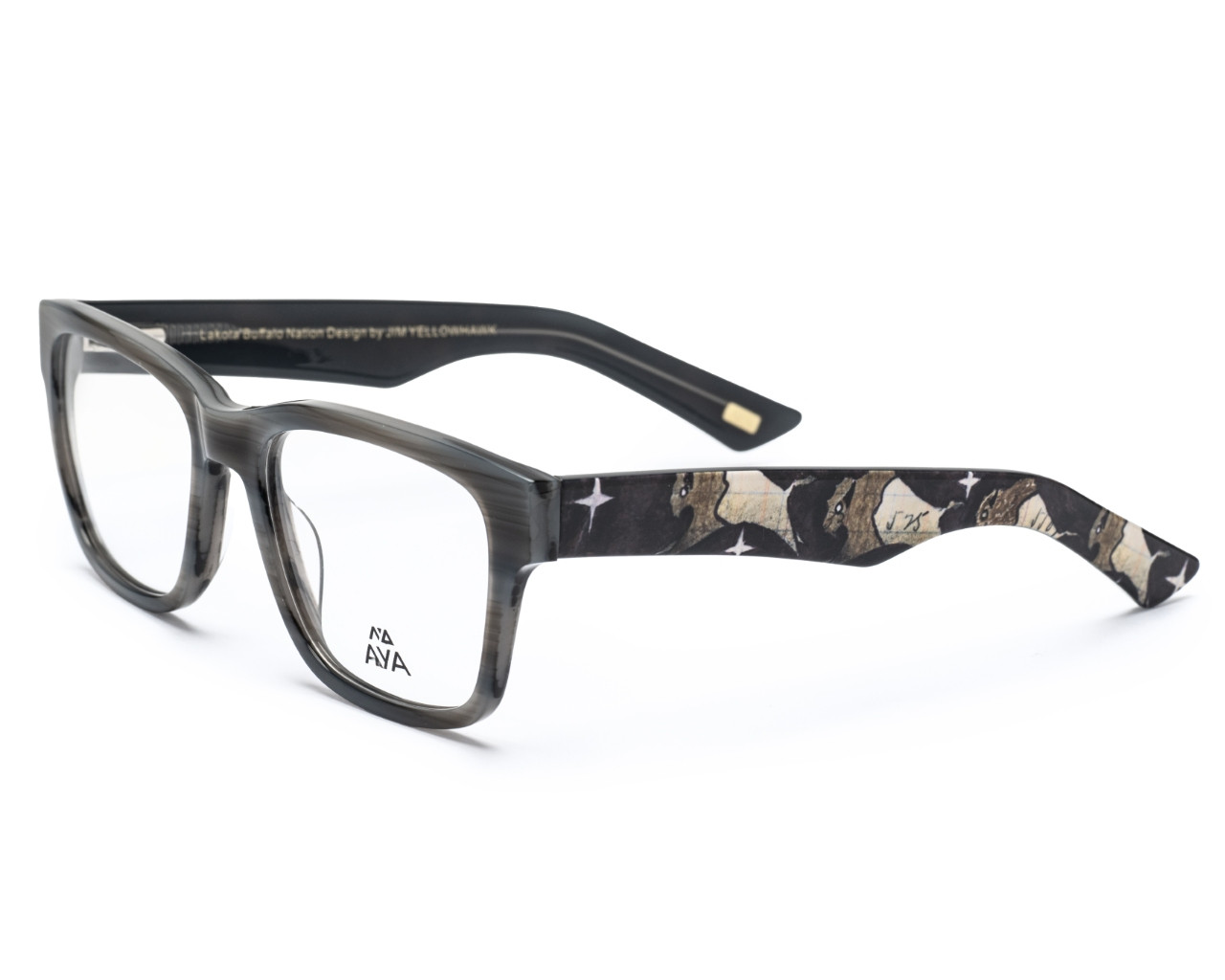 As the first collaboration between Jim Yellowhawk and AYA Optical, Ledger draws inspiration from the rich tradition of Plains Indian ledger art, a powerful narrative form that thrived from the 1860s to the 1920s and experienced a revival in the 1960s. The style's name honors the accounting ledger books repurposed by Plains Indians as a canvas for storytelling.