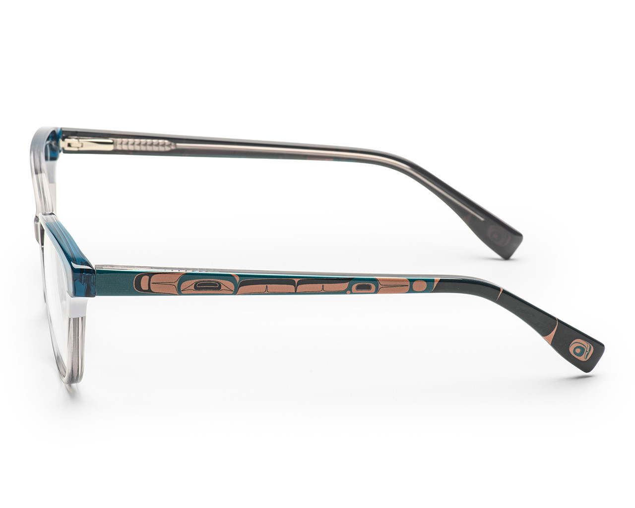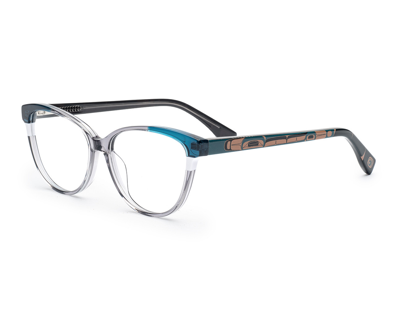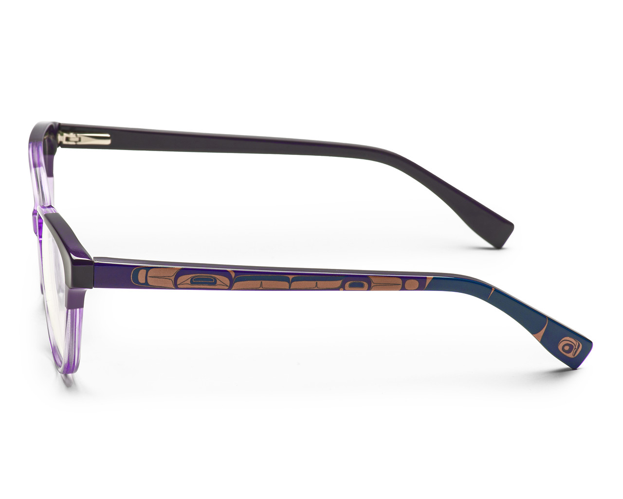 The temples of the Luna frames feature a stunning humpback whale detail, designed by the renowned artist Phil Gray. This unique element not only enhances the aesthetic appeal but also connects the wearer to the beauty of nature and indigenous artistry.