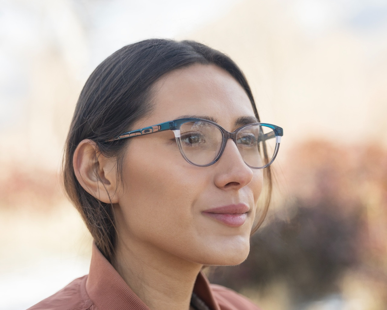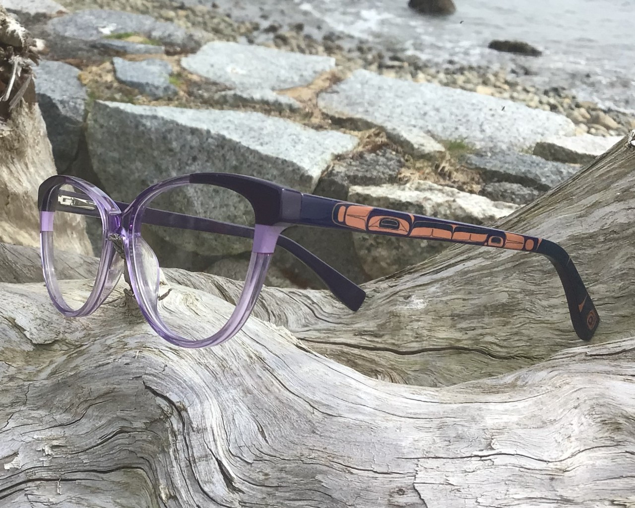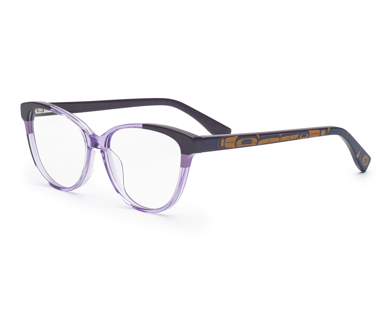 The temples of the Luna frames feature a stunning humpback whale detail, designed by the renowned artist Phil Gray. This unique element not only enhances the aesthetic appeal but also connects the wearer to the beauty of nature and indigenous artistry.
