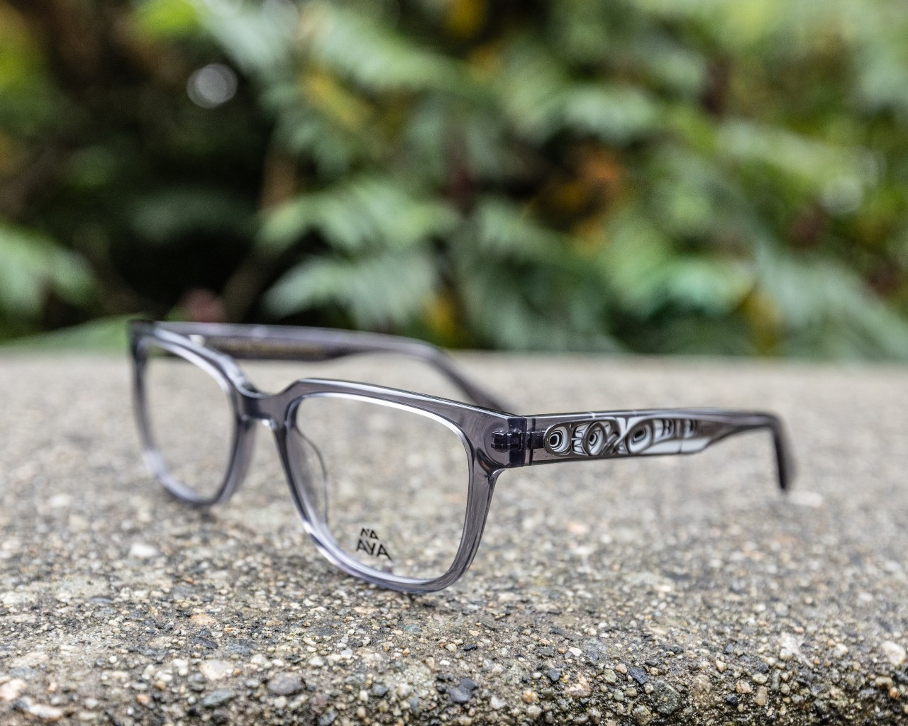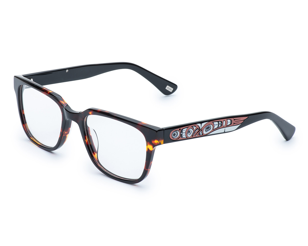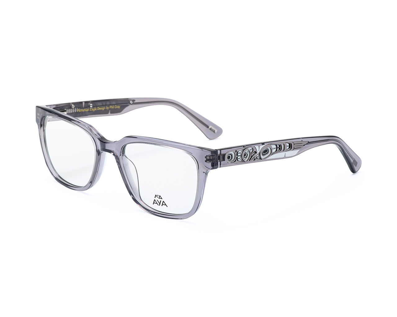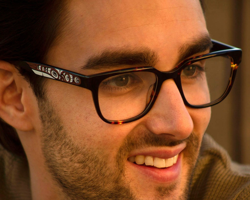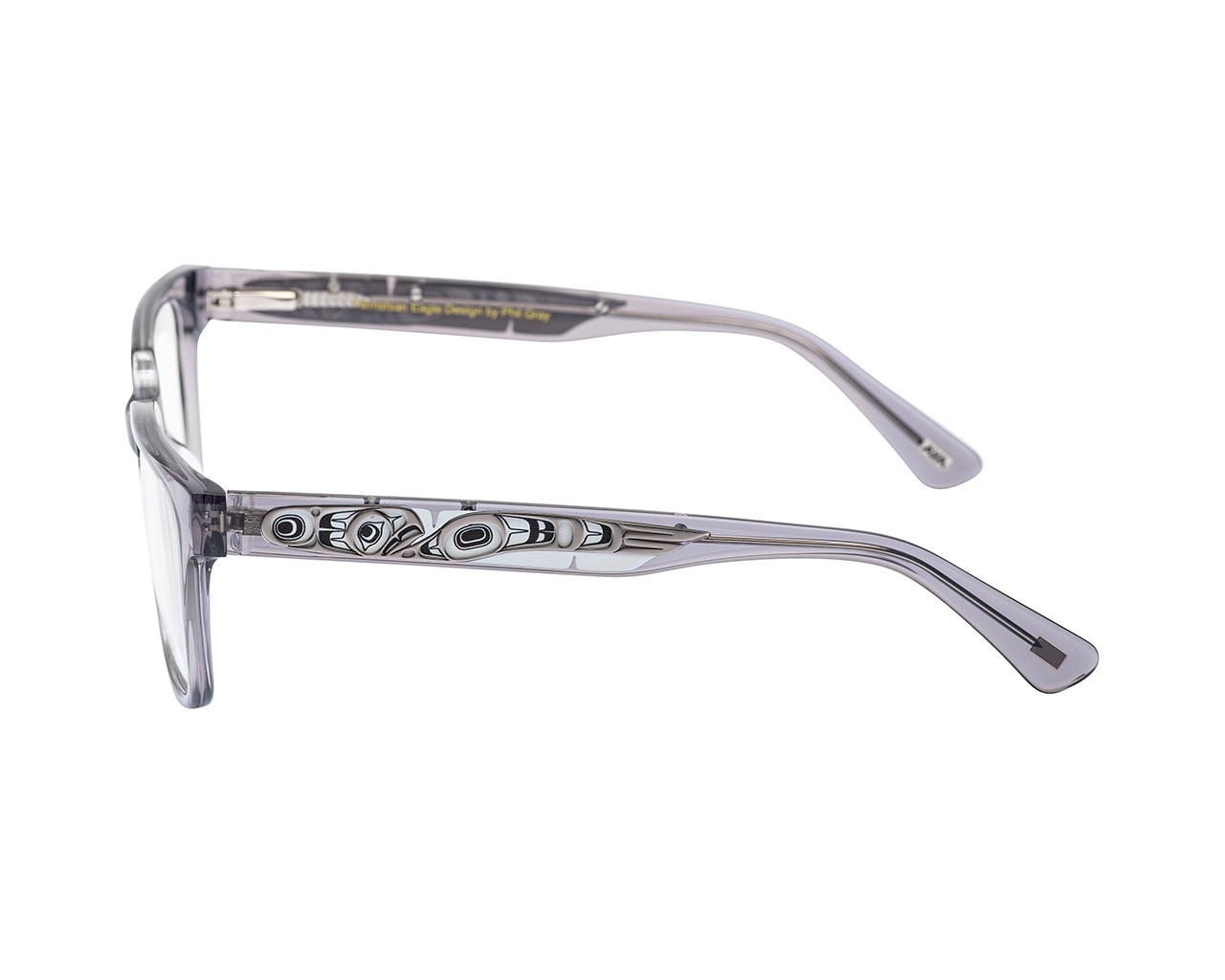 Available in warm Havana brown or classic grey, these frames are handmade and really the first of their kind. Spring hinges allow a little extra room to make for the perfect fit. Featuring an Eagle design by the very talented Ts’msyen and Cree Nations artist Phil Gray.