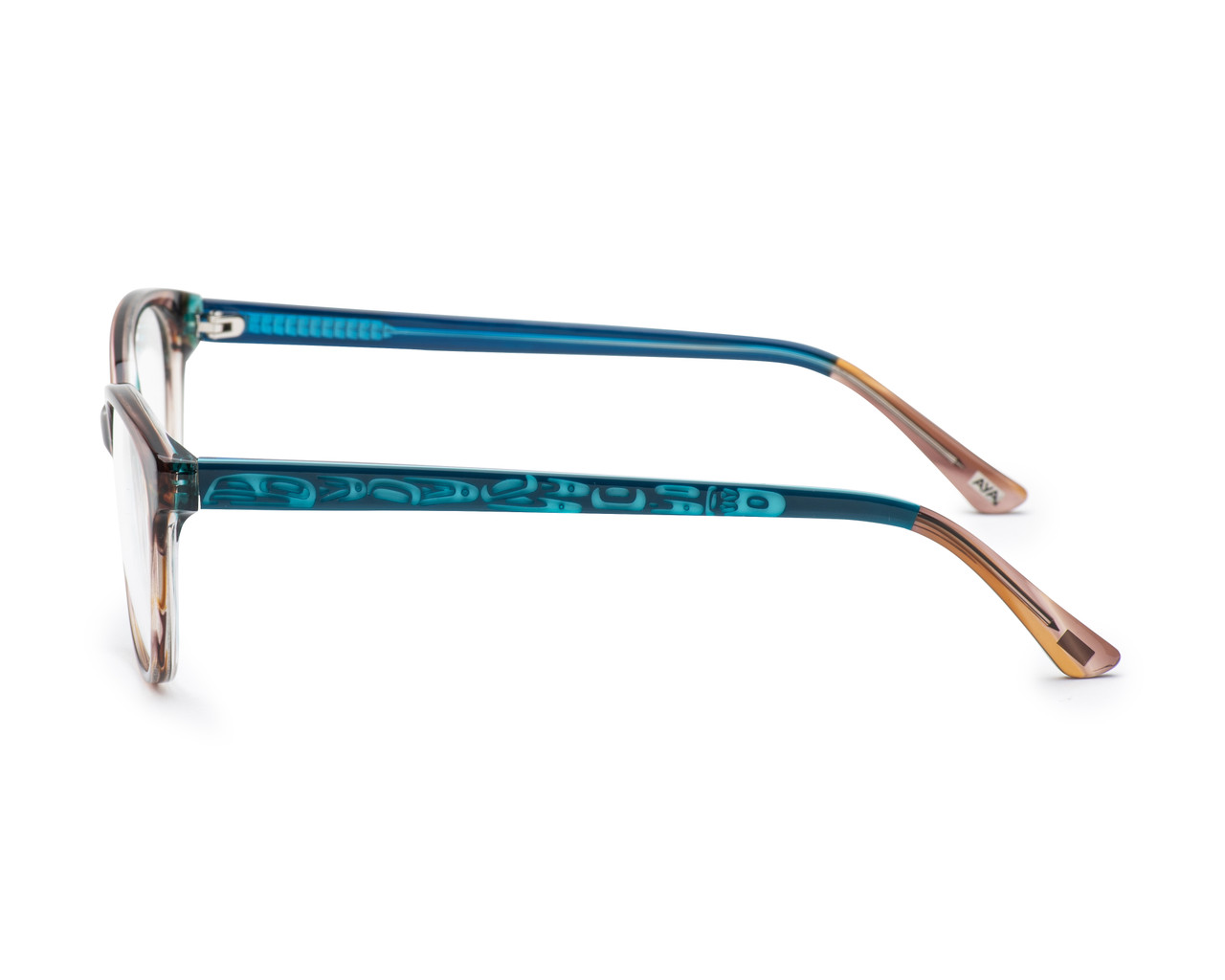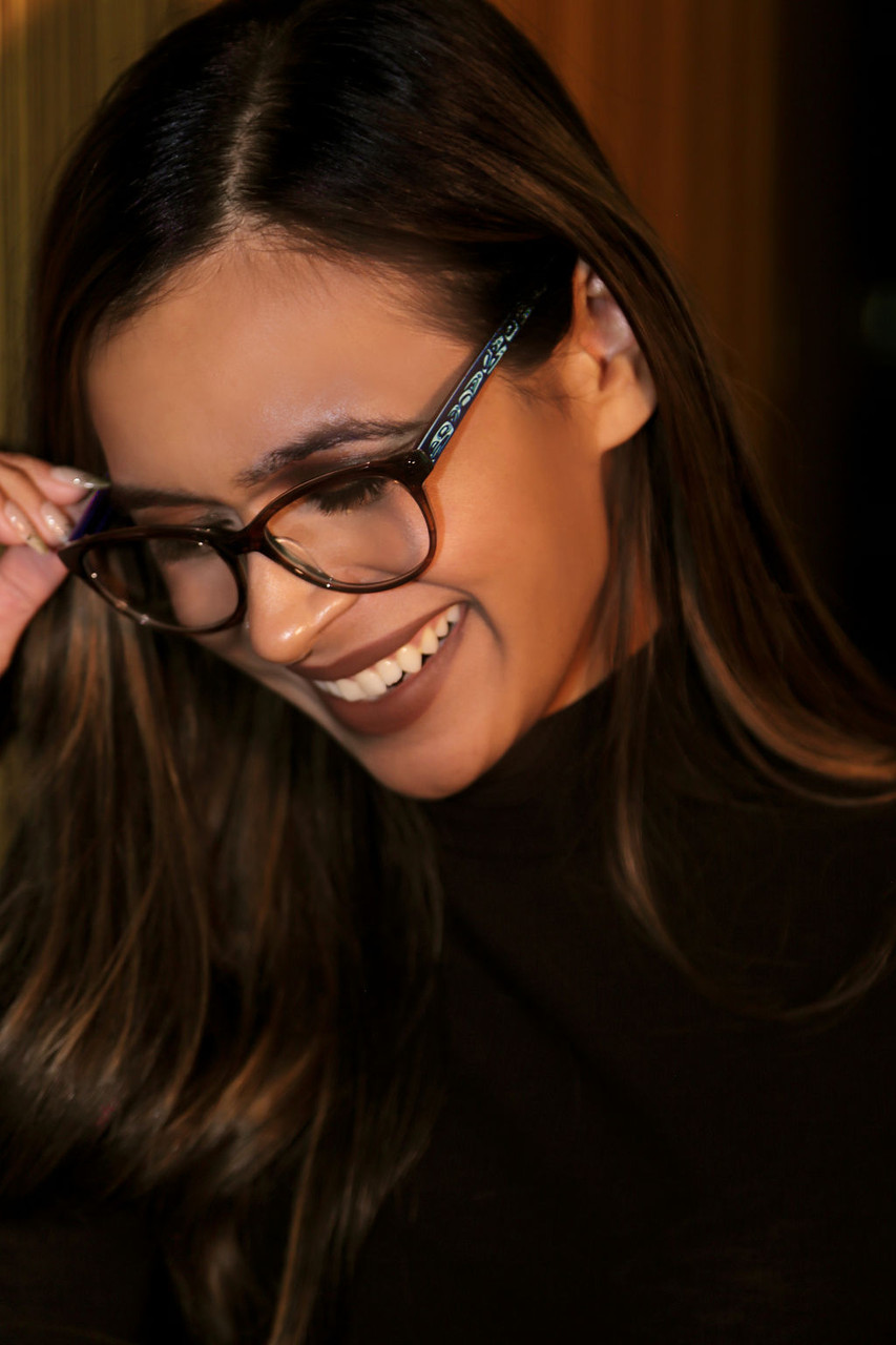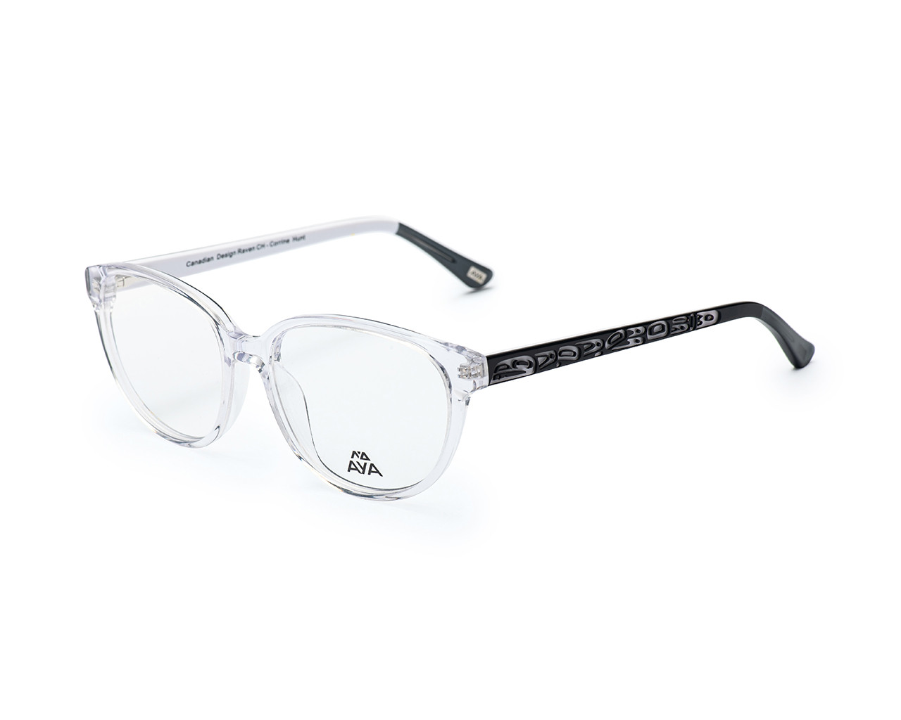 Aya's model "Catherine" is a delicate yet stylish option that can easily work with a high-powered suit or a weekend casual look. Available in warm crystal brown with blue hues or crystal clear--take your pick! Incredibly detailed raven artwork embellishes the temples and then transitions again into smoke crystal tips.