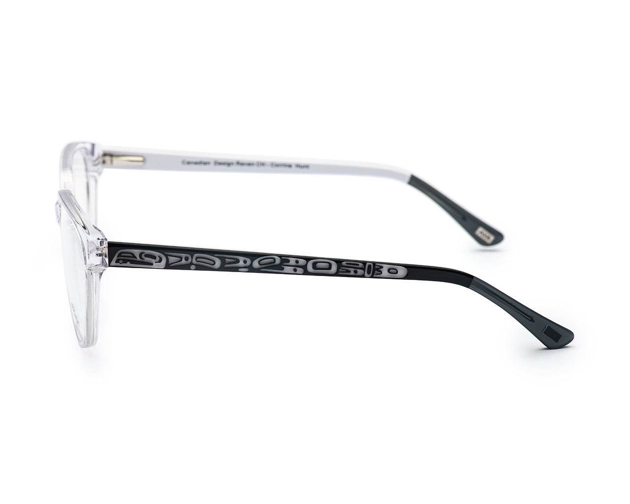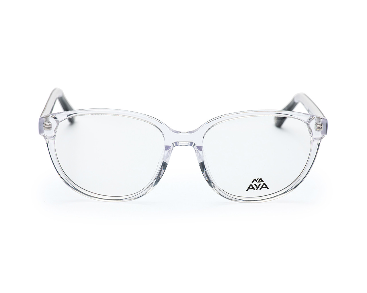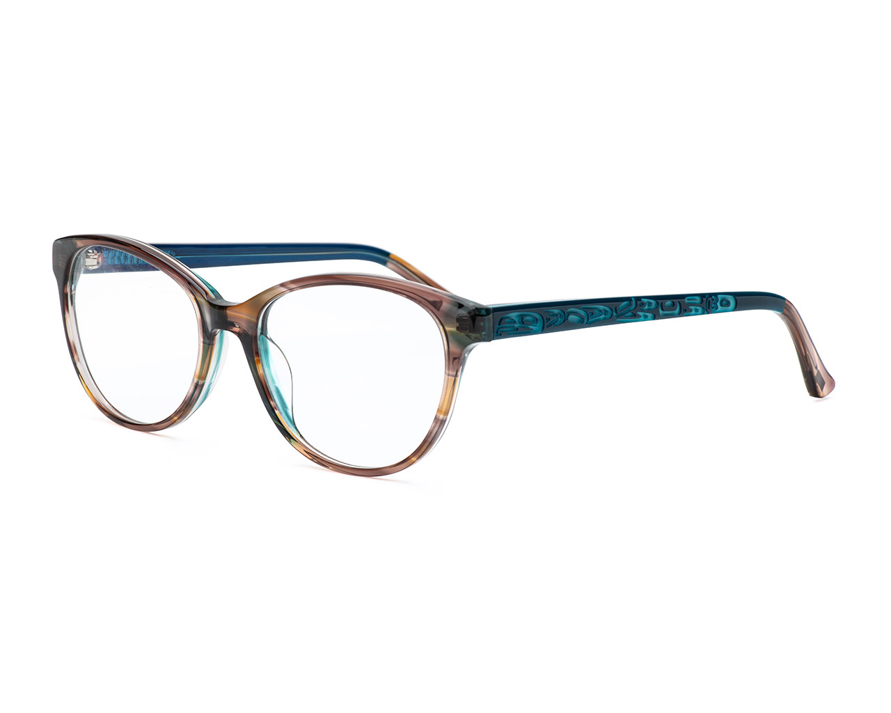 Aya's model "Catherine" is a delicate yet stylish option that can easily work with a high-powered suit or a weekend casual look. Available in warm crystal brown with blue hues or crystal clear--take your pick! Incredibly detailed raven artwork embellishes the temples and then transitions again into smoke crystal tips.