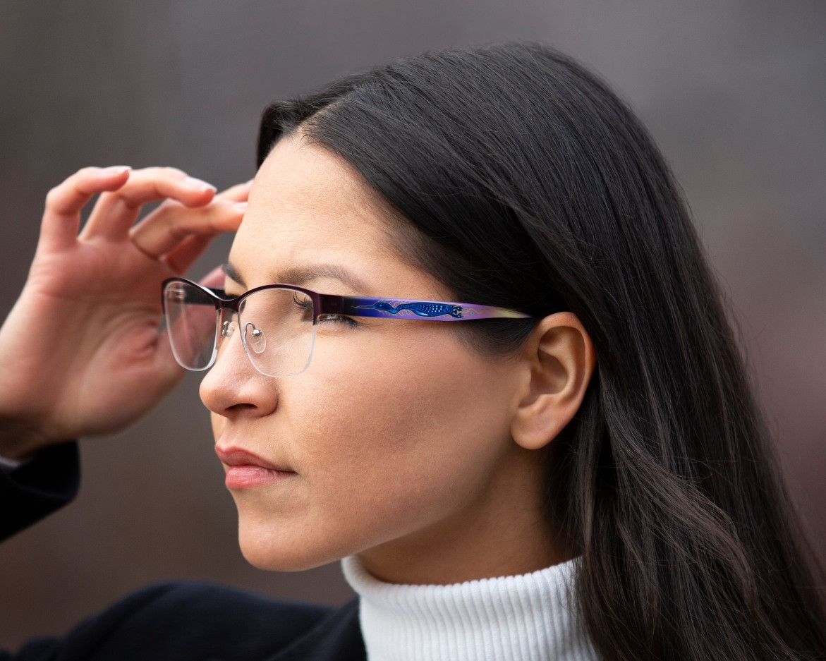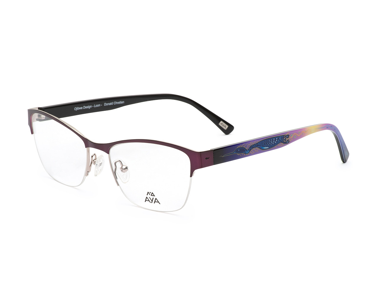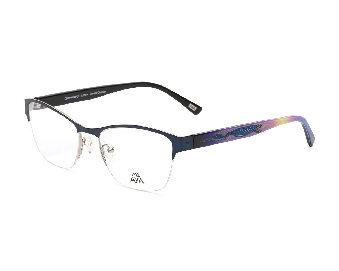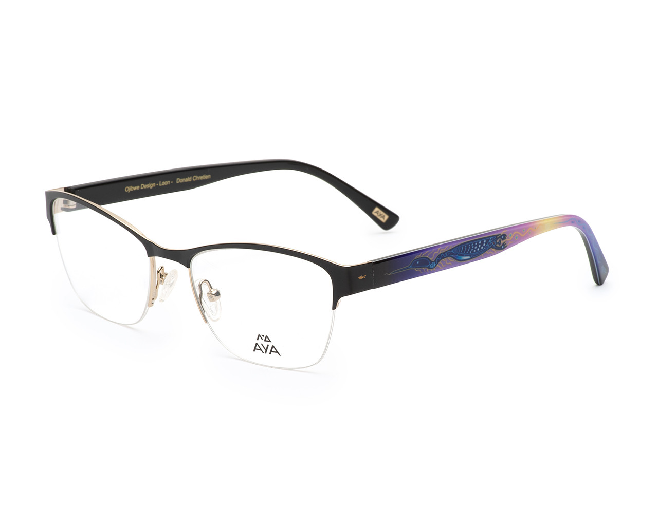 Bonnie is a delicate yet stylish option that can be worn virtually anywhere. Lightweight metal and acetate combination frame. Slightly upswept for a subtle cat eye look and adjustable nose pads for increased comfort and customized fit. Featuring the awe inspiring artistry of Ojibwe artist Donald Chretien. The loon clan was given the power of chieftainship, and by working with the crane clan ensured a balanced government. The loon is a great listener and proudly speaks for others.