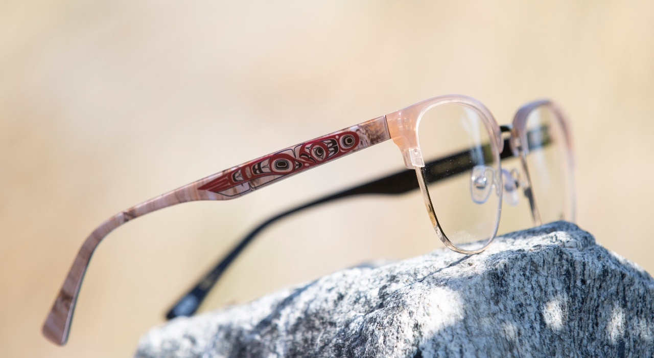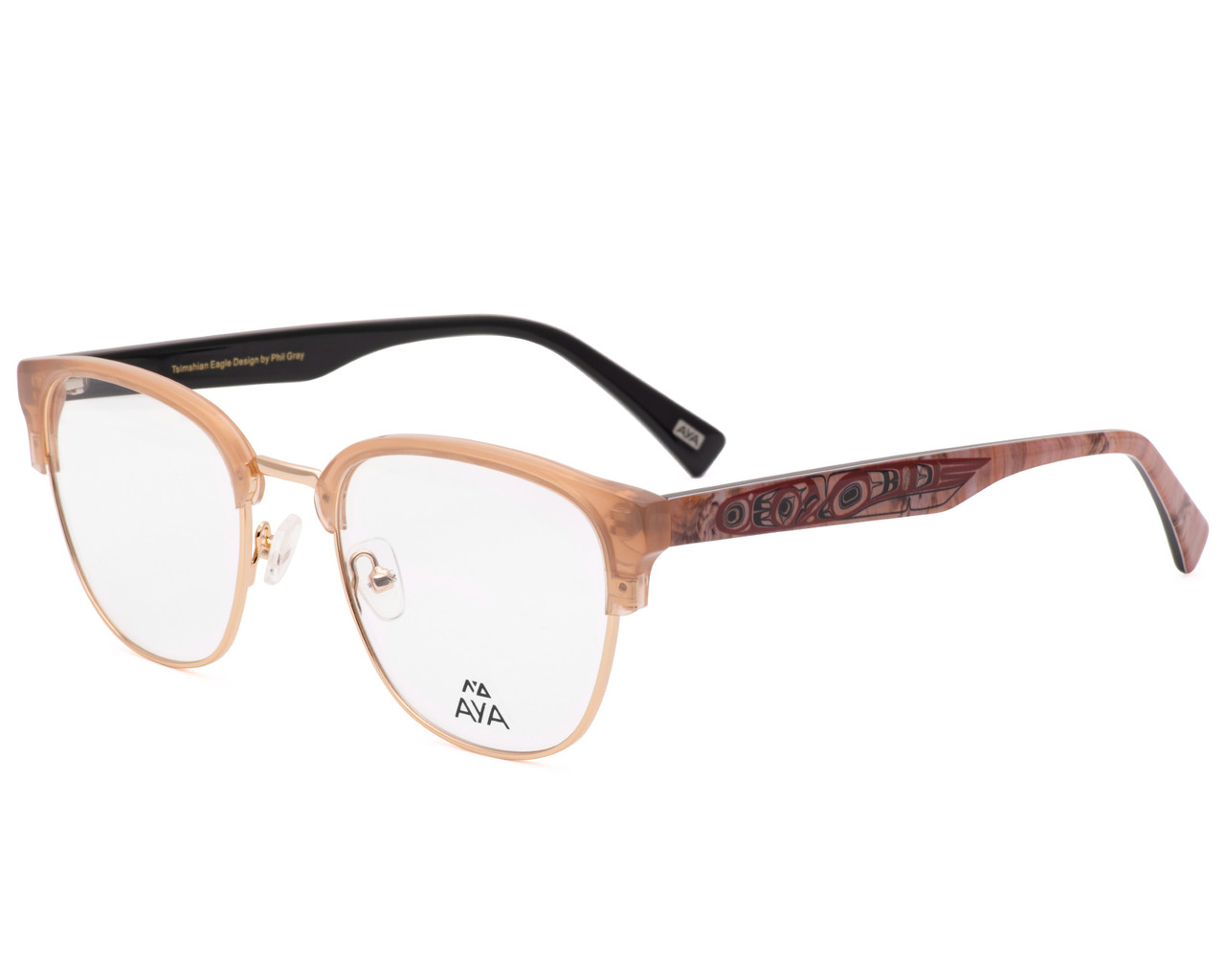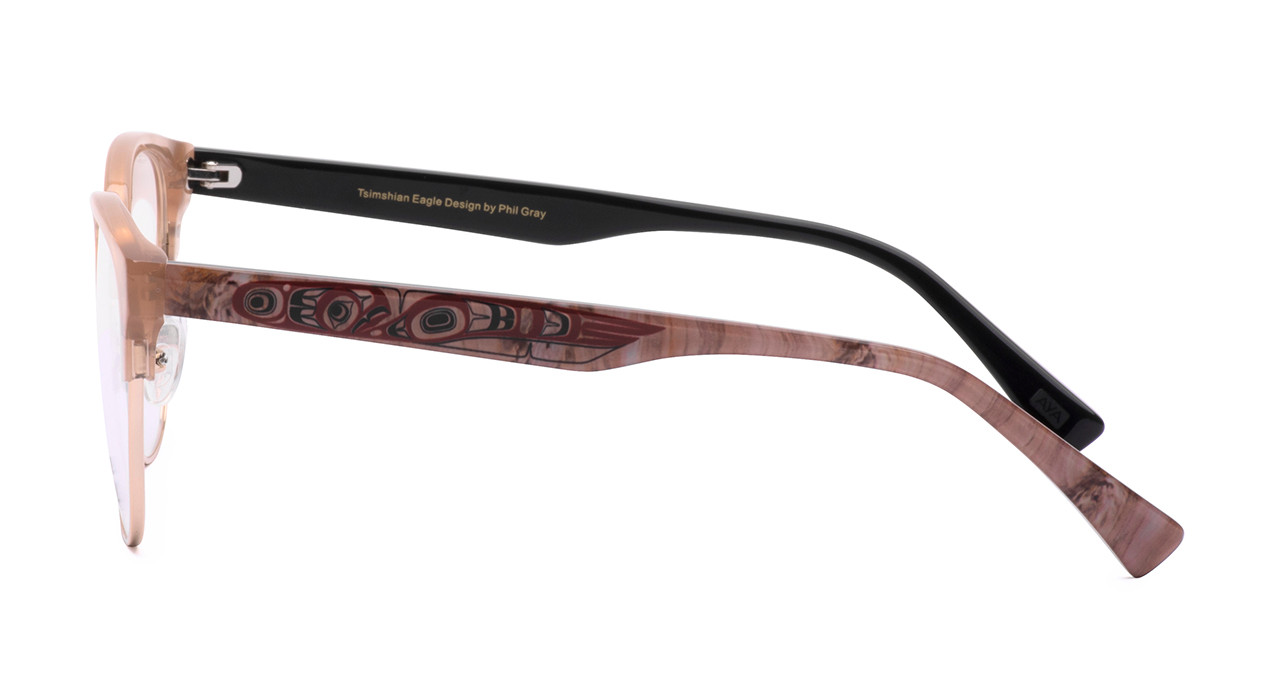 - Champagne with polished gold metal and light wood look temples with red art highlights