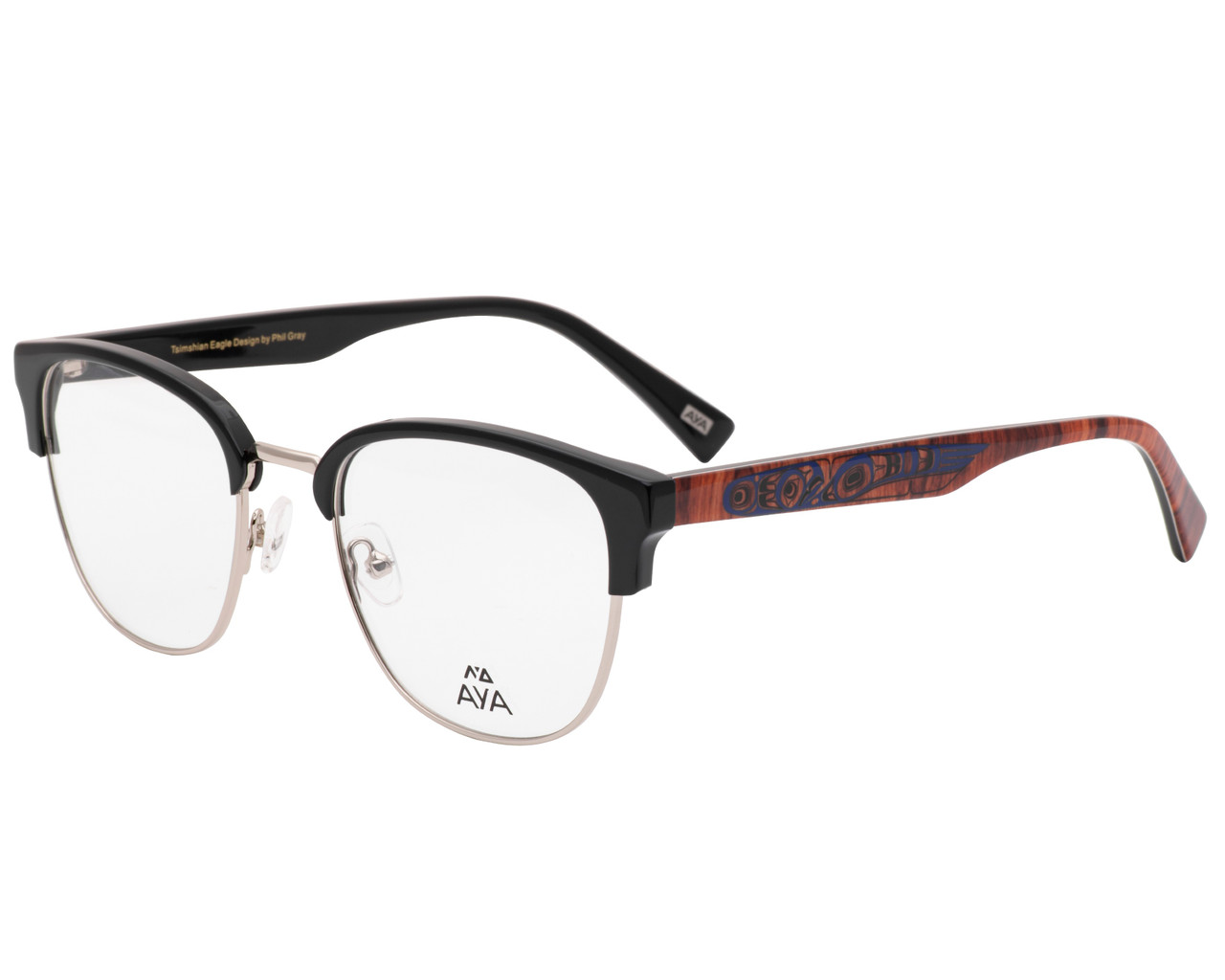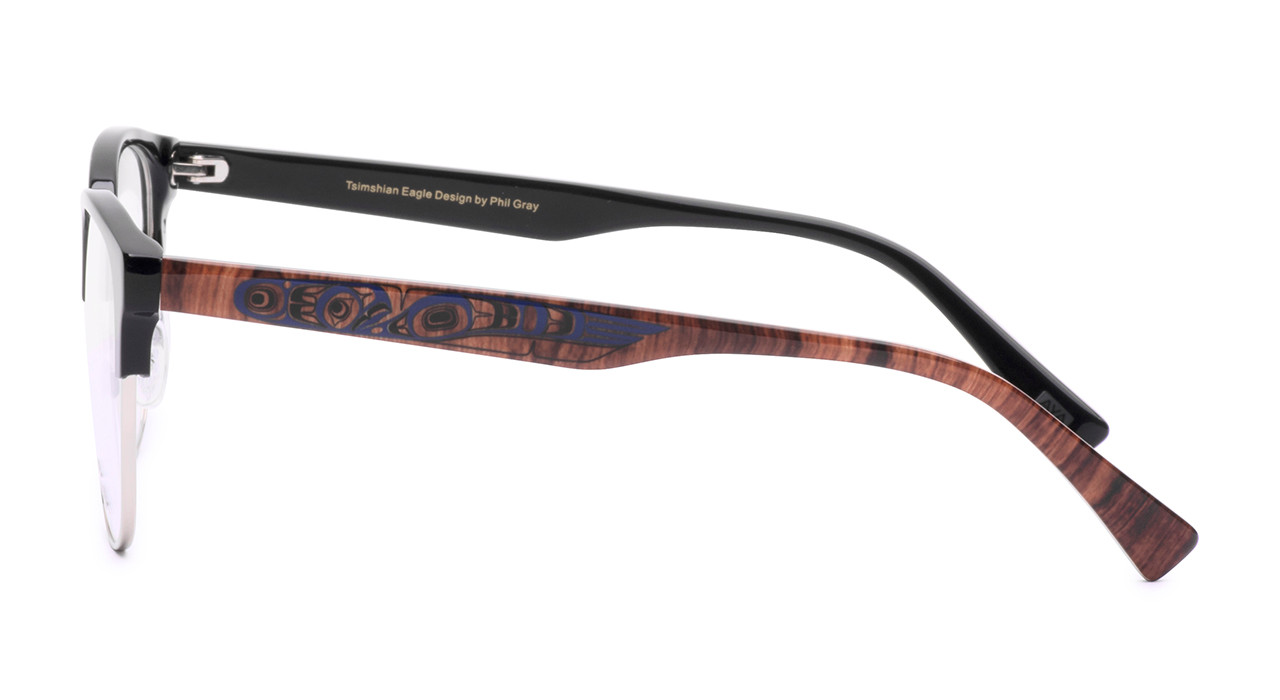 - Gloss Black with polished silver metal and warm dark wood look temples with blue art highlights.