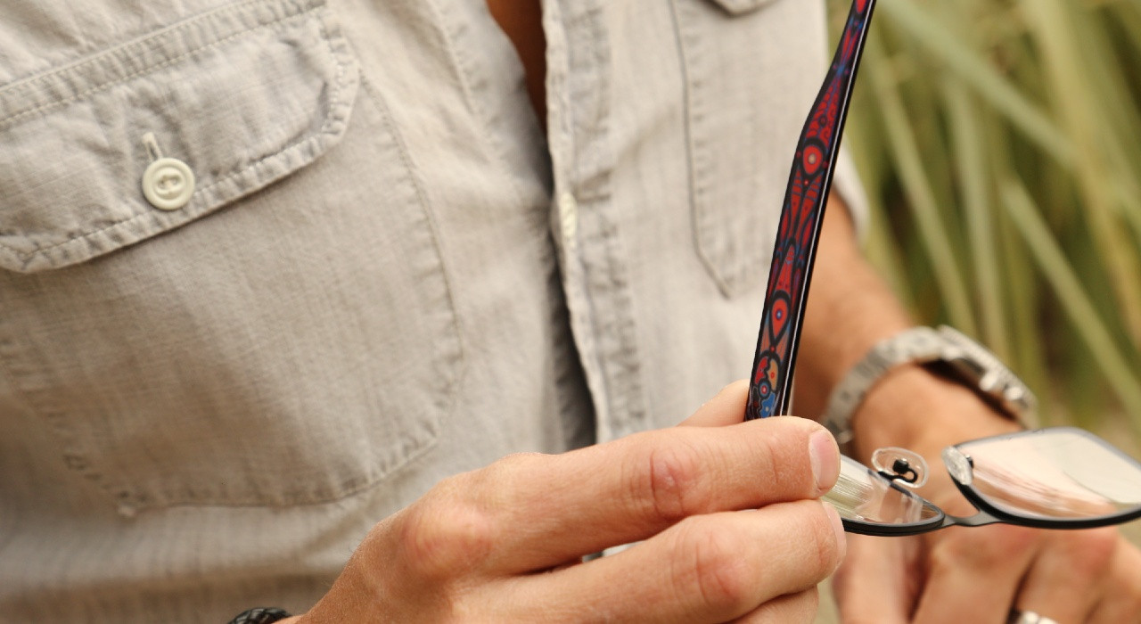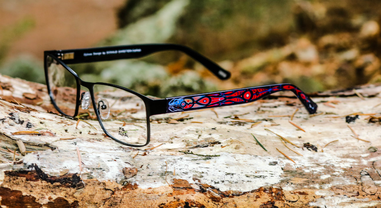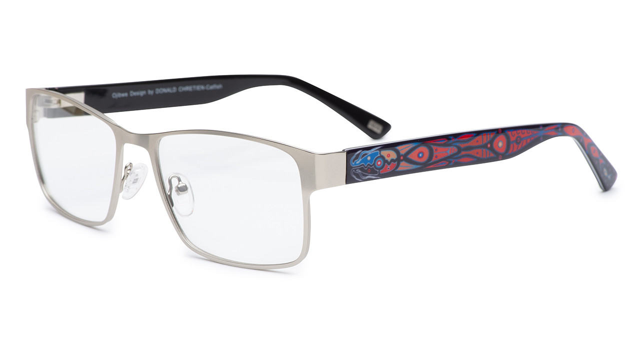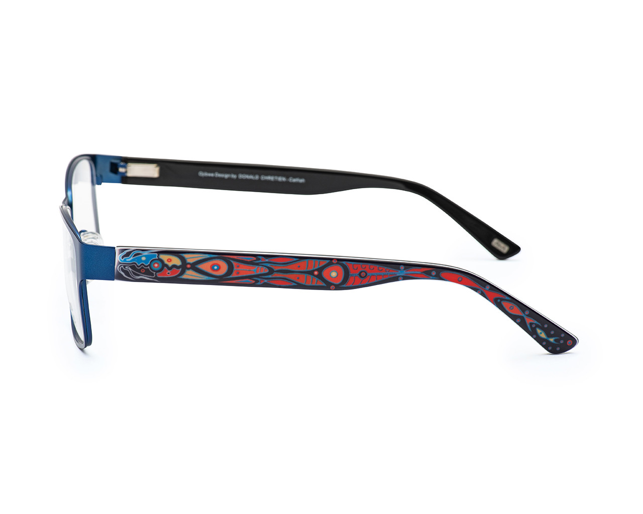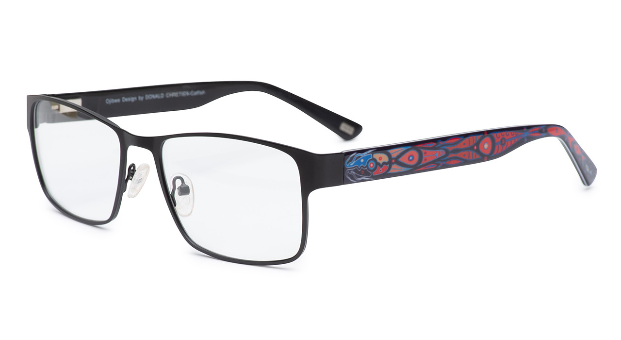 This frame is definitely for larger faces! Bold and over-sized Jacob optical frame spotlights the incredible Catfish design of Ojibwe artist Donald Chretien.