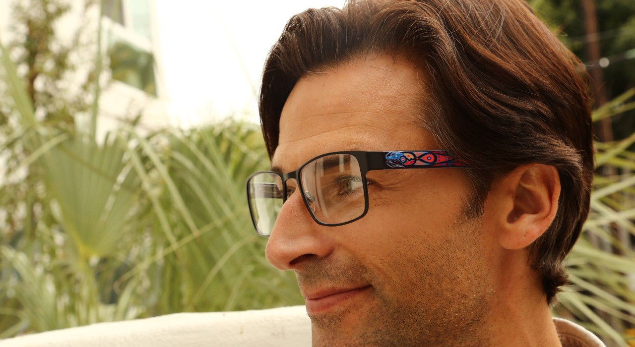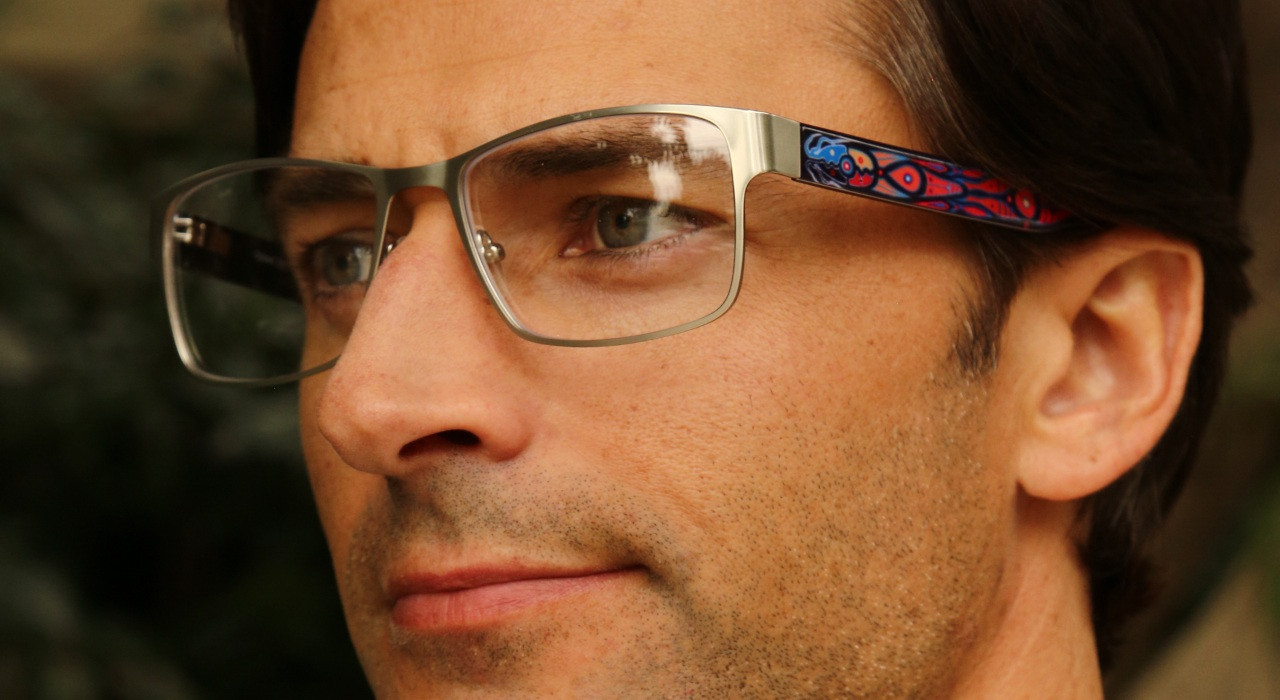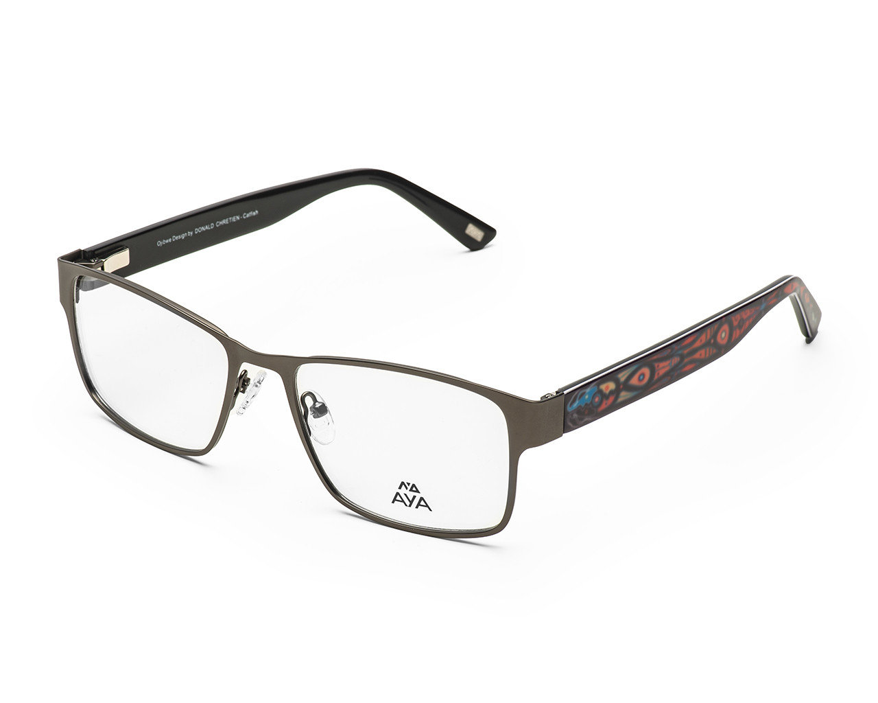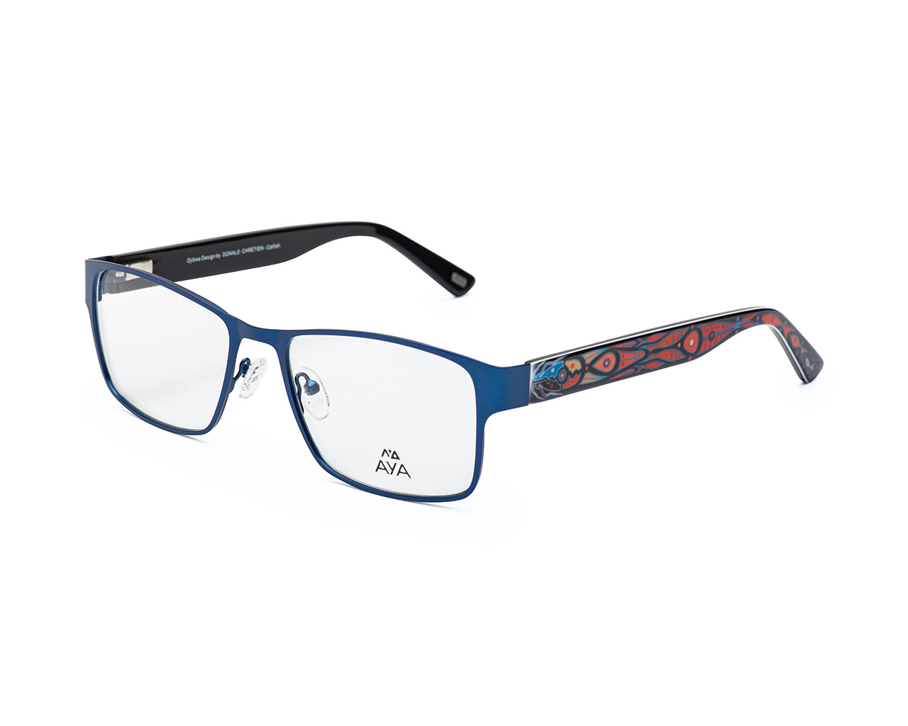 This frame is definitely for larger faces! Bold and over-sized Jacob optical frame spotlights the incredible Catfish design of Ojibwe artist Donald Chretien.