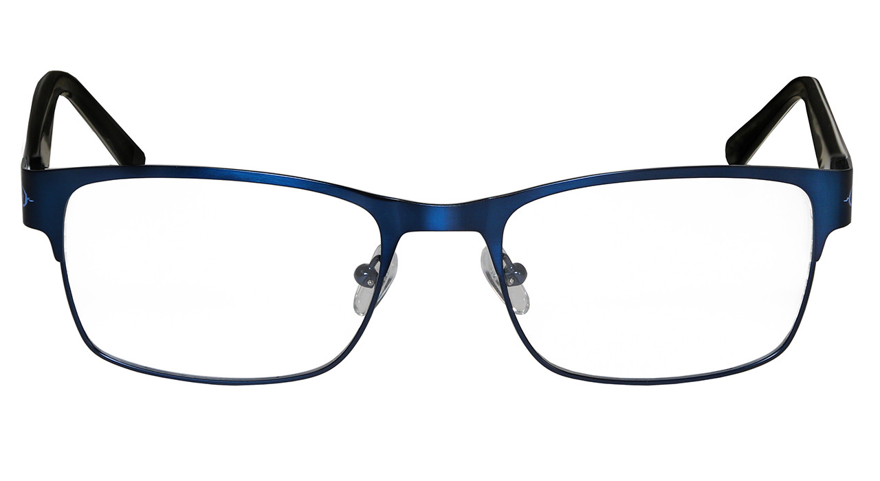 This new frame is unisex, lightweight with adjustable nosepads and able to accommodate progressive lenses. Available in a tasteful satin blue front (medium size) or matte black (large size).