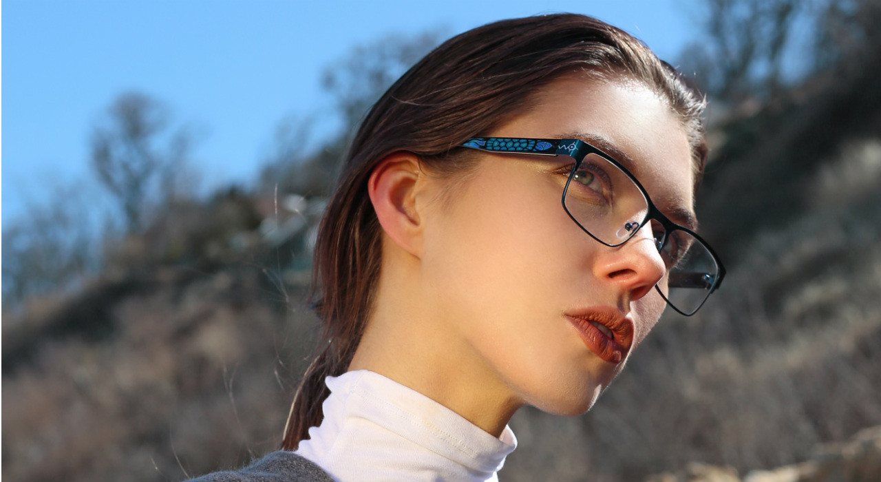 This new frame is unisex, lightweight with adjustable nosepads and able to accommodate progressive lenses. Available in a tasteful satin blue front (medium size) or matte black (large size).